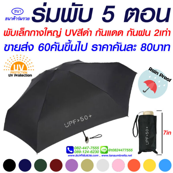 ร่มพับ 5 ตอน คุณภาพดี กะทัดรัด พกพาสะดวก ผลิตจากวัสดุกันน้ำคุณภาพสูง ทนทานต่อแรงลม พับเก็บง่าย เหมาะสำหรับพกพาในกระเป๋า มีน้ำหนักเบา มีให้เลือกหลากสี ใช้ได้ทั้งกันแดดและกันฝน สั่งขั้นต่ำตามเงื่อนไข พร้อมส่งทั่วประเทศ รับประกันคุณภาพสินค้า