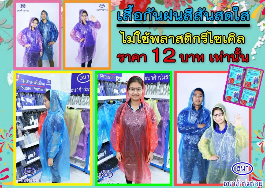 ทางร้านธนาค้าร่มรวย ไม่ได้เก่งเฉพาะเรื่องร่มเพียงแค่อย่างเดียว เพราะว่าตอนนี้ร้านธนาค้าร่มรวย ได้นำเสื้อกันฝนแบบต่าง ๆเข้ามาขายแล้วครับ โดยมีแบบให้เลือกมากมายให้เหมาะกับสมกับการใช้งาน โดยวัสดุที่นำมาผลิตเป็นเสื้อกันฝนนั้นเป็นพลาสติกเกรดพรีเมี่ยม ทำให้มั่นใจได้เลยครับว่าจะแข็งแรงทนทานอย่างแน่นอน โดยเสื้อกันฝนที่ขายที่ร้านธนาค้าร่มรวยนั้น มีราคาเริ่มต้นเพียงแค่ชุดละ 12 บาทเพียงเท่านั้น สำหรับท่านที่สนใจสามารถสั่งซื้อได้กับทางร้านเลยนะครับ